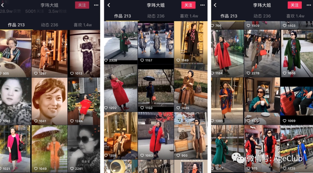 AgeClub了解到,有创业者给抖音账号“李玮大姐”做内容运营,粉丝目前虽然才3.5万,但基本沉淀的都是对时尚穿搭有追求的中老年用户,定位精准。