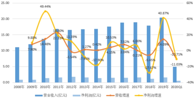2008-2020年加加食品营业收入与净利润变动趋势(单位:亿元,%)