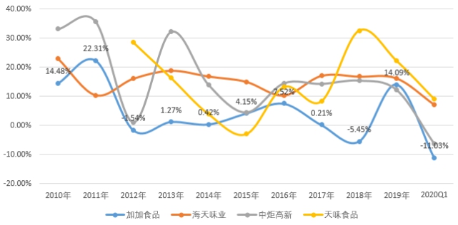 2010-2020年加加食品与同业竞争者营收增速走势对比(单位:%)
