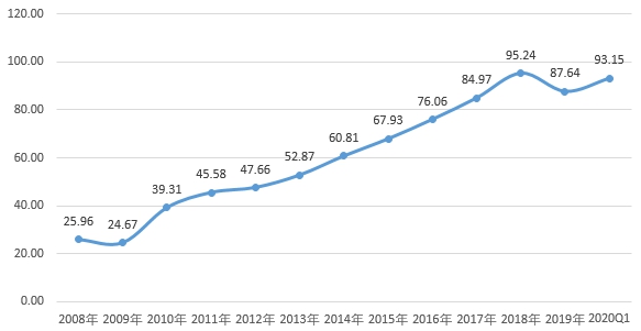 2008-2020年加加食品应收账款和应付账款的规模(单位:亿元)