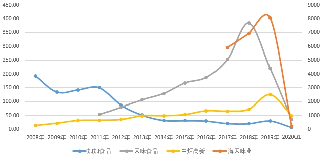 细扒财务指标可以发现,自2013年开始加加食品的利润率在行业中处于垫底的位置,相较后来上市的海天味业,2019年利润率相差近20个百分点。相较同样布局高端产品的千禾味业,相差6个百分点。