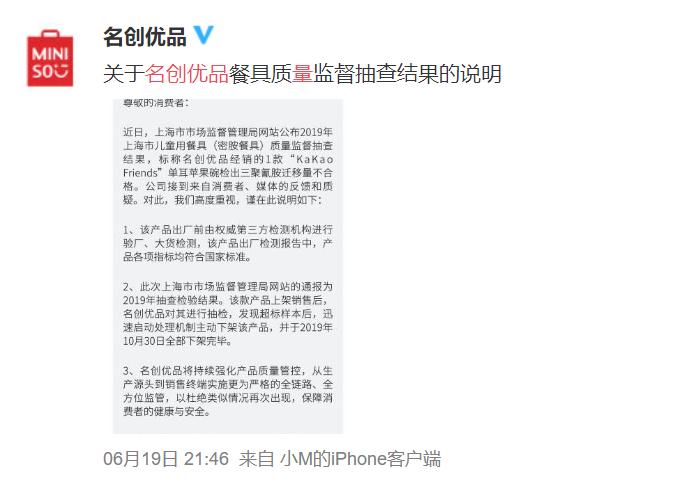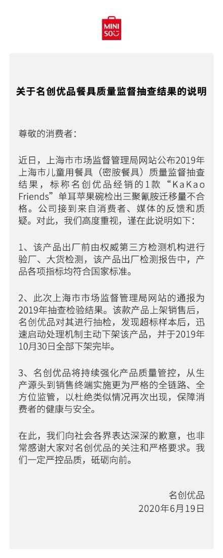 针对产品“三聚氰胺迁移量超标”事件,名创优品官方微博19日晚发布声明称,据@名创优品 发布关于名创优品餐具质量监督抽查结果的说明 ,该产品出厂前由权威第三方检测机构进行验厂、大货检测,该产品出厂检测报告中,产品各项指标均符合国家标准。此次上海市市场监督管理局网站的通报为2019年抽样检查结果。该款产品上架销售后,名创优品对其进行抽检,发现超标样本后,迅速启动处理机制主动下架该产品,并于2019年10月30日全部下架完毕。