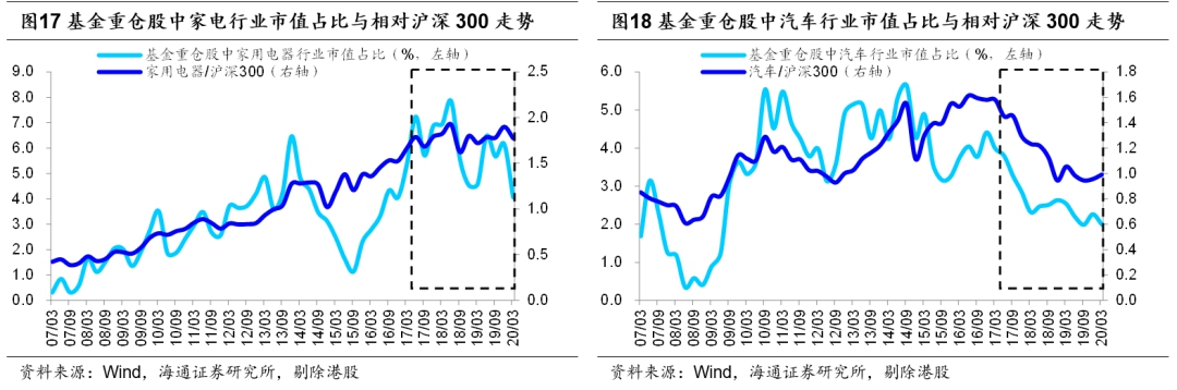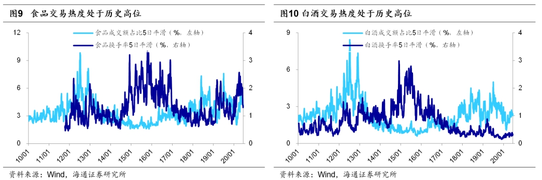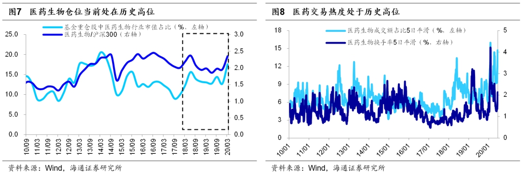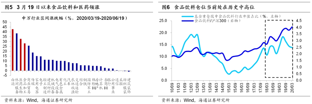 过去3个月市场主线是追求确定性。今年2月中下旬新冠疫情在海外开始蔓延,受此影响全球股市普遍大跌,随后各国央行开始注入流动性,各地股市也在3月中下旬先后见底回升。A股上证综指在3月19日见底2646点,随后反弹至今(截至20200619,下同)正好3个月。在这三个月里,由于这次疫情百年一遇,投资者对疫情冲击下的基本面预期并不明朗,因此转向确定性较高的板块:根据Wind一致预期,在19年12月2020年沪深300净利同比预测为6.0%,在今年2月国内疫情爆发后,下调至5.8%,在3月海外疫情爆发后,下调至5.0%,随着国内外疫情蔓延和高频经济数据脆弱,截止2020/6/19,下调为0.7%。3月19日以来各行业中涨幅最大的五个行业及对应涨幅分别为白酒(43%)、休闲服务(38%)、医药生物(33%)、食品(28%)和商业贸易(26%),均是受益于内需的行业。其中医药股除了内需逻辑外,更是受益于疫情本身。市场演绎至今,这种交易确定性的逻辑已经演化到了极致。我们以各个板块的成交额占股市整体成交额的比重来衡量行业的交易热度:医药生物板块最近一周成交额占比为15%,位于2010年以来从低到高100%的分位;食品板块成交额占比为4.1%,历史分位数76%;白酒板块占比2.4%,分位数63%。目前医药、白酒、食品三个板块的估值均处于历史高位,医药行业PE(TTM,下同)为50.1倍,位于2010年以来从低到高95%的分位;食品行业PE为39.9倍,分位数为83%;白酒行业PE为37.7倍,分位数98%。从基金配置看,当前我们只能看到一季报的数据,20Q1基金重仓股中医药生物股的市值占比为17.6%,处在2010年以来从低到高86%的分位;白酒的市值占比为9.9%,历史分位数70%;食品的市值占比为3.9%,分位数64%。考虑到Q2上述三个行业涨幅较大,基金对这些行业的配置比例预计将高于Q1。综合来看,虽然医药和食品饮料行业长期来看具备投资价值,但是短期处在高涨幅、高估值、高配置、高交易拥挤度的状况,性价比并不高。