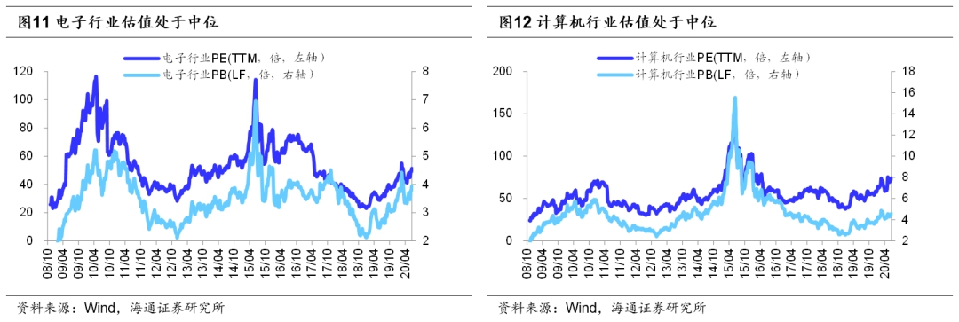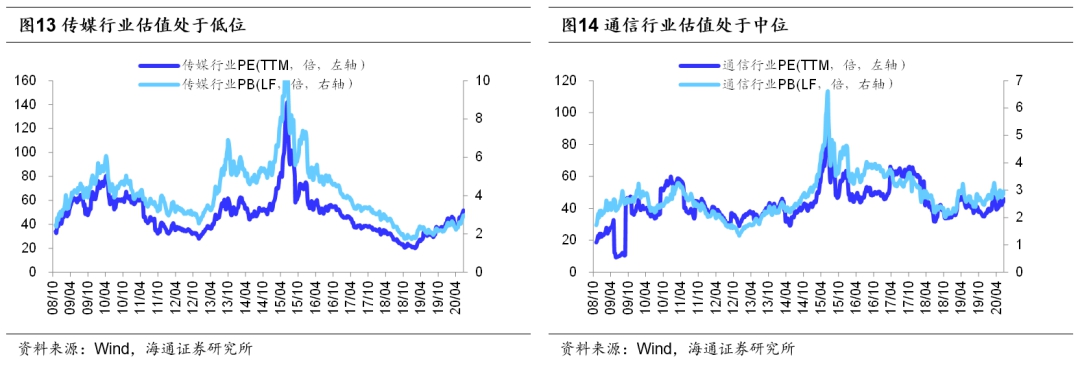 未来关注成长性。我们认为,上述交易确定性的逻辑将在基本面回升至正常水平后发生改变,待Q3企业盈利回升至两位数后,市场交易的逻辑将从偏防守的确定性逻辑转为偏进攻的成长性逻辑。这种因风险偏好提升而切换交易逻辑的情况19年以来就发生过两次:一次是19年12月初,在工业增加值、工业企业利润、PPI等数据持续改善后,市场风险偏好开始回升,上证综指从12月3日上涨至今年1月14日,最大涨幅近10%,期间涨幅较大的均是弹性较好的行业,如传媒(涨22%)、电子(20%)、计算机(17%)、券商(16%)和通信(14%);另一次是19年初,随着政策面宽松叠加流动性充裕,市场风险偏好明显提升,上证综指从1月4号的2440点上升到4月8号的3288点,最大涨幅35%,期间涨幅较大的还是高弹性品种如计算机(涨56%)、券商(54%)、电子(46%)。着眼当下,我们一直以来都强调本轮牛市的主线是科技+券商。我们在《牛市第二阶段什么行业最强?-20190730》中指出,从宏观背景看,每轮牛市的主导产业符合时代背景,如05-07 年我国处于工业化和城镇化加速阶段,地产链是主导产业,银行为他们提供融资服务,所以牛市中最强的行业是地产链+银行。而现在我国进入后工业化时代,步入信息化时代,重点发展的产业是科技类行业,同时为科技类行业提供融资服务的是券商,所以未来牛市的主导产业将会是科技+券商,市场风险偏好抬升时,主导产业表现最优。截至2020/06/19,3月19日以来TMT表现较为落后,电子/计算机/传媒/通信四个行业的涨幅分别为15%/5%/19%/1%。从估值和仓位看看,电子/计算机/传媒/通信PB(LF,下同)为3.9/4.6/3.0/3.0倍,处08年10月来从低到高74%/63%/23%/67%分位,20Q1基金重仓股中电子/计算机/传媒/通信市值占比11.5%/7.4%/5.4%/2.2%,处08Q3来从低到高91.5%/78.7%/78.7%/48.9%分位。因此整体上,科技板块当前涨幅不高,估值处于历史中位,持仓处中上位,值得关注。券商板块当前处于低涨幅、低估值、低配置的三低状态,同样值得重视:3月19以来券商指数仅涨3%,涨幅倒数;券商PB1.48倍,处08年10月来从低到高12%分位;20Q1基金重仓股中券商市值占比0.7%,处08Q3来从低到高21%分位。