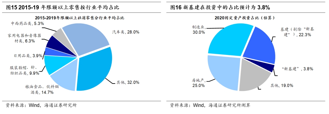 Q3聚焦科技+券商+汽车家电,Q4关注低估行业。我们认为Q3开始市场将从前期的交易确定性转向交易成长性,重点关注科技+券商,以及消费中的汽车和家电。科技方面关注新基建,新基建包括7个领域,主要聚焦科技,在大方向上与我国产业结构向信息化调整的方向一致。我们预计新基建2020年投资近3万亿元,7个领域同比增长均为两位数以上甚至过百,详见《策略对话行业:新基建的规模和机遇-20200518》。从中期产业链逻辑看,5G代表的新一轮科技周期才刚刚开始。类似12-15年的3G/4G,这次基本面的回升预计也要持续2年,5G中后期带动内容软件再到应用场景,即19年电子到20年计算机、传媒、新能源车产业。其中重点关注今年业绩弹性较大的新能源车和计算机。新能源车今年重启补贴,因此今年业绩增速将明显提升,20Q1新能源车板块净利润同比增速为-90%,我们预计2020年全年增速为10%;计算机方面主要受益于5G后产业链,20Q1净利润同比增速为-111%,我们预计2020年全年增速为10%。除了科技,券商也需重视。前文我们提出Q3市场将有望在基本面回升后迎来牛市3浪上涨,市场成交额放大将助推券商盈利改善,如果没有疫情19年12月即是牛市3浪上涨起点,当时券商股表现较强。20Q1券商归母净利润同比增速为-23%,我们预计2020年全年增速为10%。此外,中期逻辑上金融供给侧改革是当前改革的重要方面之一,“两会”后金改政策望不断落地,改革方向是做大直接融资、股权融资,券商行业将有更多政策红利,尤其是分类监管下,头部公司面临更多发展机遇。除了科技和券商,扩大内需战略下受益的汽车和家电也值得关注。前文我们已提过,食品饮料和医药虽然长期具备投资价值,但是短期性价比不高,而今年汽车、家电两个行业涨幅低、估值低、配置低,相对更优。Q4关注低估板块,低估的行业修复需要催化剂,如银行地产、钢铁采掘。我们认为Q4将迎来修复行情,银行地产要等基本面恢复,且历史上Q4的胜率高;而采掘钢铁等主要看国企改革,预计Q3政策重点是“六稳”、“六保”的需求类政策,改革类政策可能要等Q4。