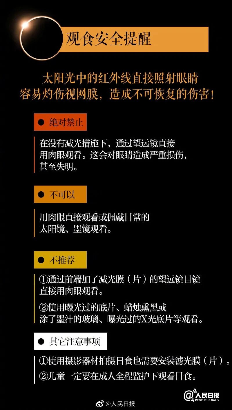 专家介绍,普通观测者,可以在市面上买到专门用于观测日食的太阳观测眼镜。这类观测眼镜使用时,要注意不要连续直视太阳超过3分钟,应该在休息半分钟后继续观看。