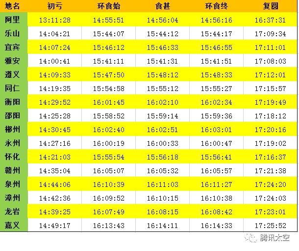 环食带上部分城市时刻表