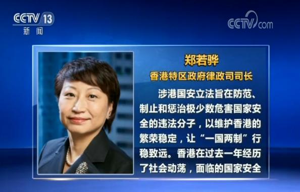 香港特区政府律政司司长郑若骅21日发表声明说,涉港国安立法旨在防范、制止和惩治极少数危害国家安全的违法分子,以维护香港的繁荣稳定,让“一国两制”行稳致远。她说,香港在过去一年经历了社会动荡,面临的国家安全局势日趋严峻,香港特别行政区行政和立法机关难以在短期之内,自行完成维护国家安全的相关立法,因此全国人大常委会有需要和有迫切性从国家层面建立健全香港特区维护国家安全的法律制度和执行机制。她将率领律政司全力支持和配合涉港国安立法工作。