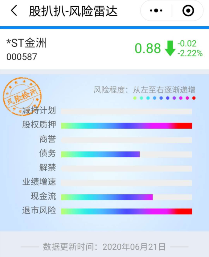 其实,对于这类个股风险,我们可以用专业的风险排除工具,股扒扒小程序来提前看一下。比如输入000587,就可以看到金洲慈航相关信息。