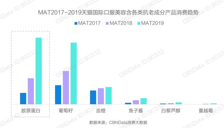 CBNData报告显示,口服抗老是口服美容中增速最快的声称,胶原蛋白、葡萄籽、血橙是三大消费者最偏爱的成分。