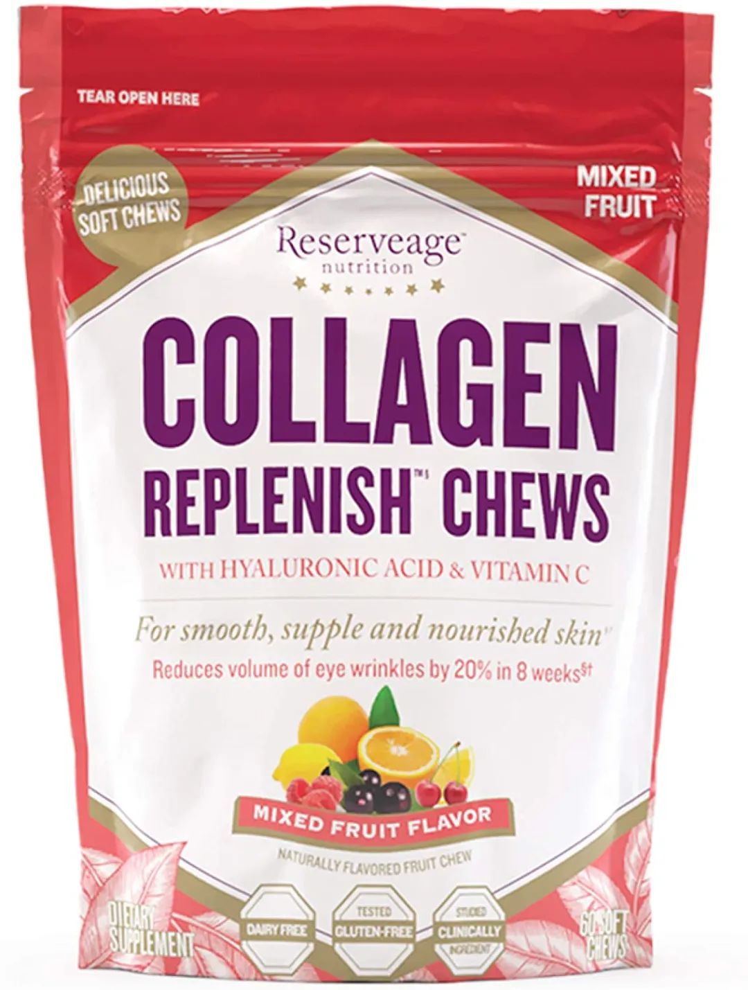 Reservage胶原蛋白软糖,含生物活性胶原蛋白肽、透明质酸和维生素C,促进皮肤健康。