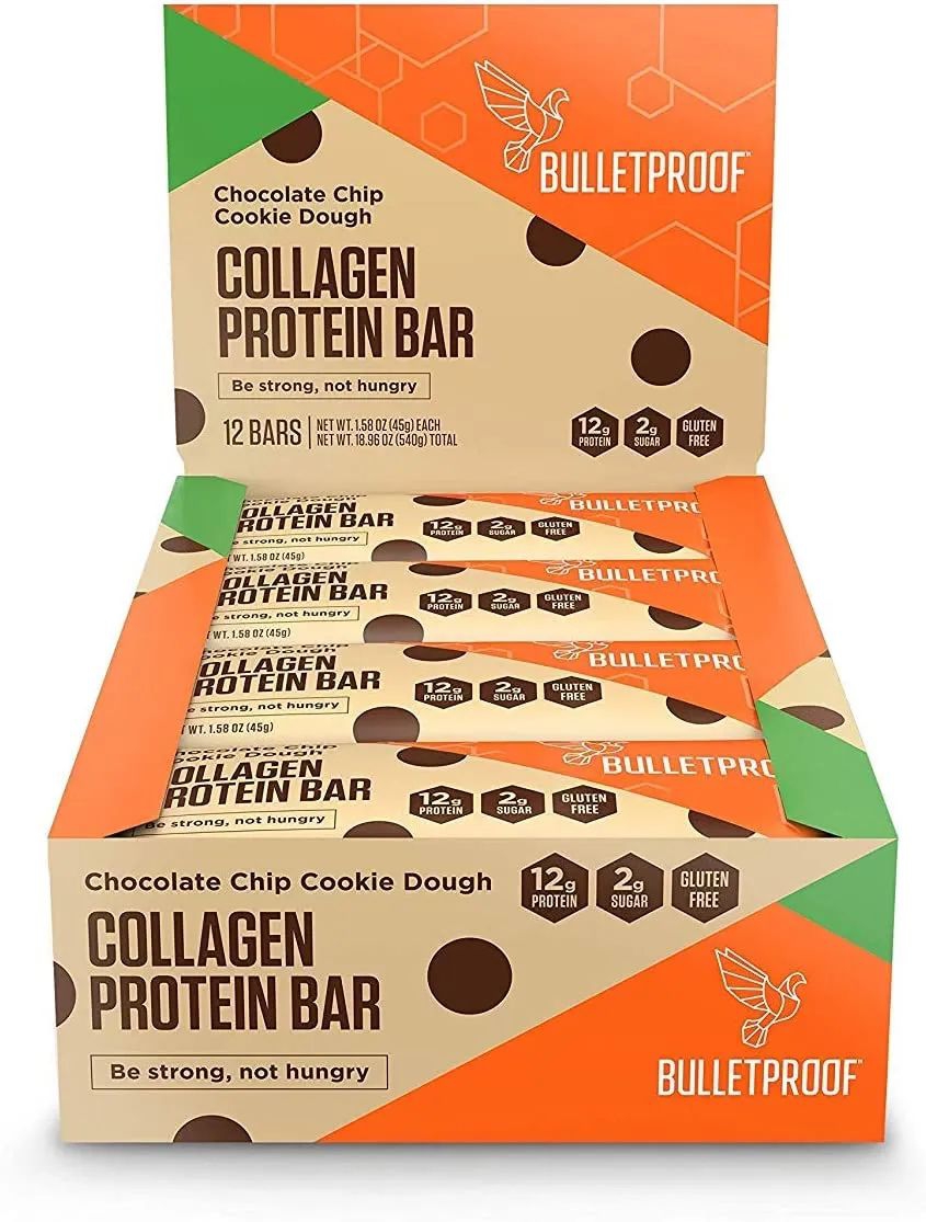 Bulleetproof胶原蛋白能量棒,含奶牛来源的胶原蛋白,对骨骼、关节和皮肤有益。