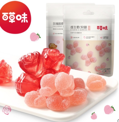 百草味玫瑰胶原蛋白软糖,每100克软糖含1000mg水解胶原蛋白。