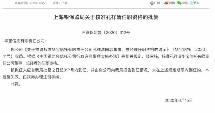 批复中显示,上海银保监局于2020年6月15日核准孔祥清华宝信托公司董事、总经理的任职资格。