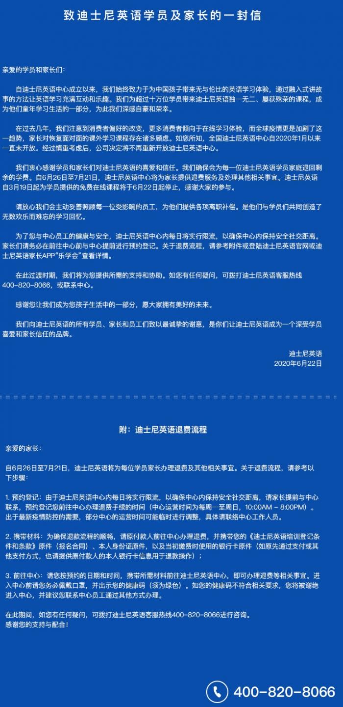 自6月26日至7月21日,迪士尼英语中心将为家长提供退费服务及处理其他相关事宜。对于受影响的员工,迪士尼英语也将提供各项离职补偿。