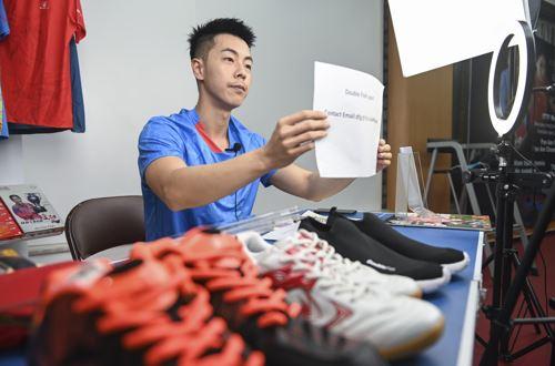 6月18日,广州海珠区的一家企业,主播通过直播将联系方式告知采购商。-视觉中国