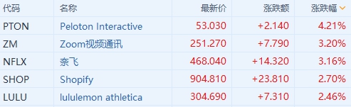 由于美国疫情反复,在家概念股全线上涨。运动器材$Peloton Interactive(PTON.US)$涨超4%。
