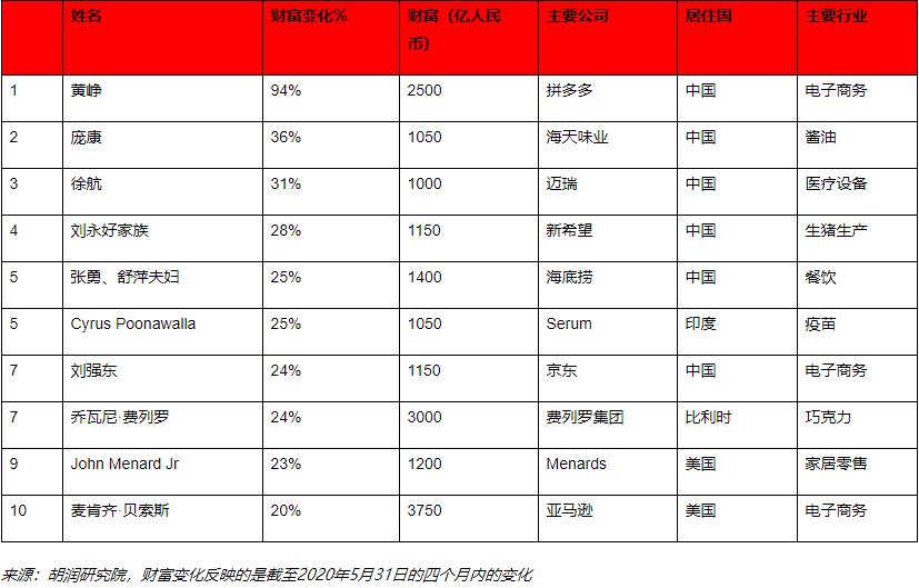 胡润表示,新冠疫情以来最大的两个赢家是电商亚马逊的杰夫·贝佐斯和拼多多的黄峥,他们的财富分别增长了1500亿和1240亿人民币,几乎都来自过去两个月。另一个大赢家是视频会议软件Zoom 50岁的袁征,他的财富从1月份的300多亿增长到现在的900多亿,4个月前他排在全球第555位,今天快要敲开全球百强的大门了。