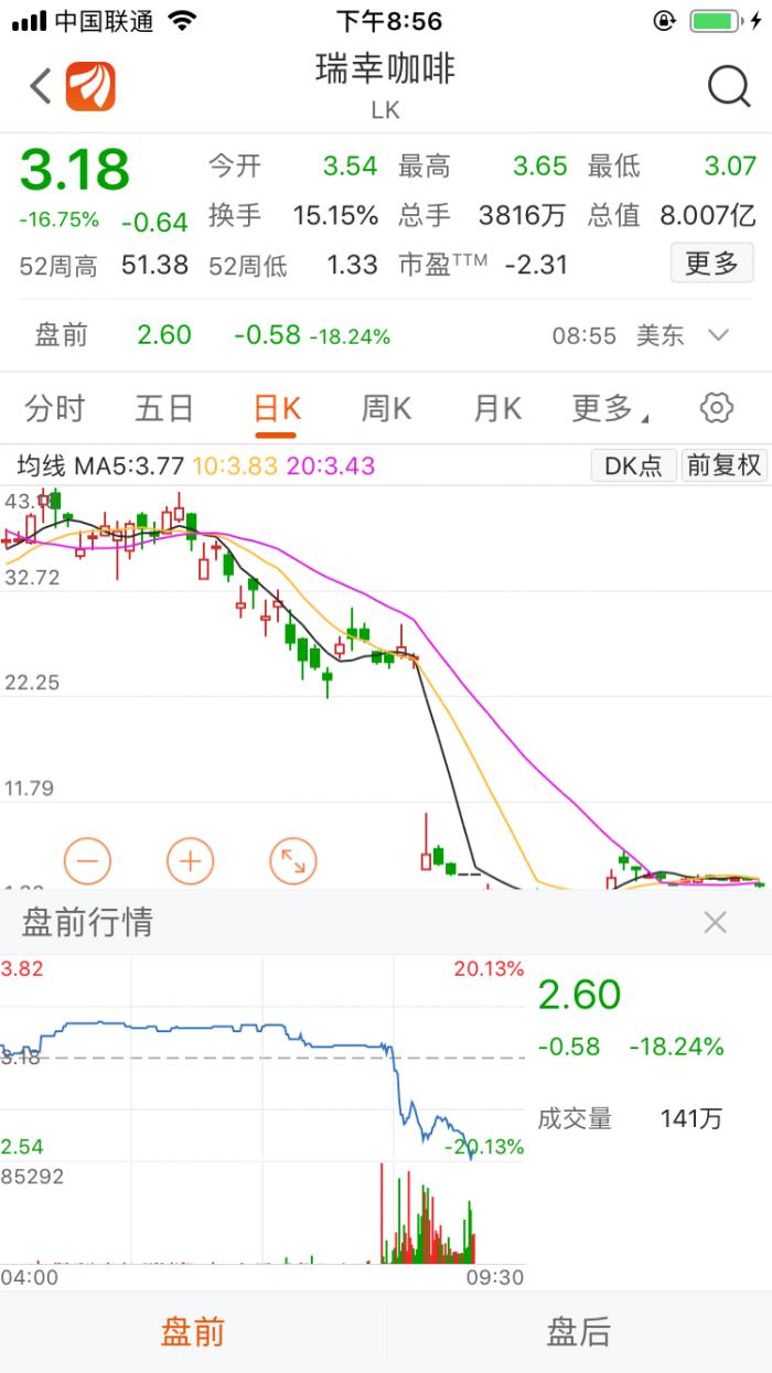 4月2日瑞幸22亿造假案之后,股价自26.2美元跌至6美元左右,跌幅超75%。随后两个交易日,瑞幸咖啡继续大跌16%、18.4%。4月7日起停牌,停牌前股价为4.39美元。