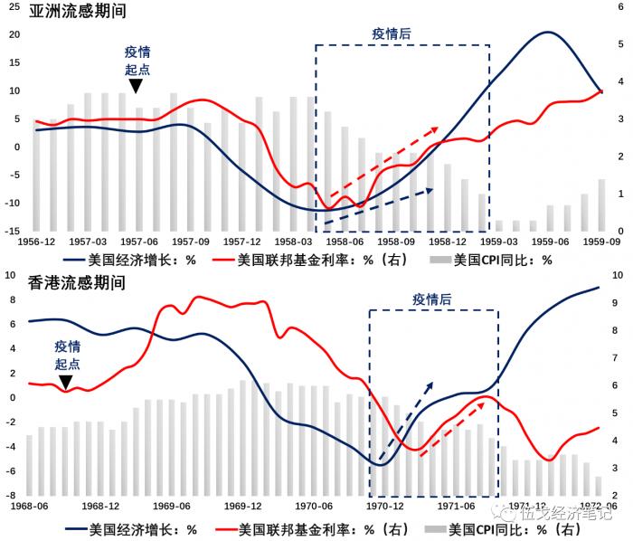 即使在疫后经济修复这种特殊的时期,经济的拐点也能预示利率的拐点。例如,美国曾遭遇亚洲流感和香港流感两次较为严重的疫情。在疫后经济增速出现拐点之后,虽然其经济远未回到疫情前的水平,物价甚至还在走低,但联邦基金利率却很快呈现出由降到升的拐点。