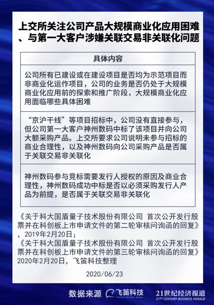 第二个问题,据公司招股书,神州数码为公司的第一大客户,2017年至2019年,对神州数码的销售金额分别占公司营收的21.14%、57.90%、59.52%,占比一半以上。在中科大建设的量子保密通信“京沪干线”技术验证及应用示范项目等项目招标中,公司并没有直接参与,但公司的第一大客户神州数码中标了该项目并向公司大额采购产品。对此,在第二轮问询函中,上交所要求公司说明,公司未直接参与“京沪干线”等项目招标的商业合理性,通过神州数码系统集成服务有限公司采购是否属于关联交易非关联化。