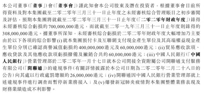 中国支付通解释,综合亏损大幅增加主要由于以下各项的综合影响:1、就本集团预付卡及互联网支付现金产生单位及其高端权益现金产生单位分别已确认商誉减值亏损约4亿港元及6000万港元;2、贸易应收款项、应收贷款及其他应收款项亏损拨备及撤销合共6000万港元;3、中国人民银行营业管理部于2020年1月17日就本公司间接全资附属公司开联通支付服务有限公司的违规事件向其处以行政罚总额约2600万港元;4、开联通因中国人民银行营业管理部就上述违规事件进行调查而暂停新业务介入;5、爆发新冠肺炎疫情对本集团整体业务表现及财务业绩造成不利影响。