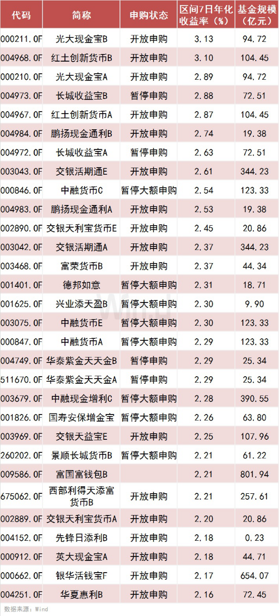 除了逆回购,货币基金也是现金理财的好工具。Wind数据显示,目前不少货币市场基金仍处于开放申购期,部分7日年化收益率均值最高甚至超过了3%,整体看收益率较前几日国债逆回购稍低,但一样可以把空闲的资金利用起来。