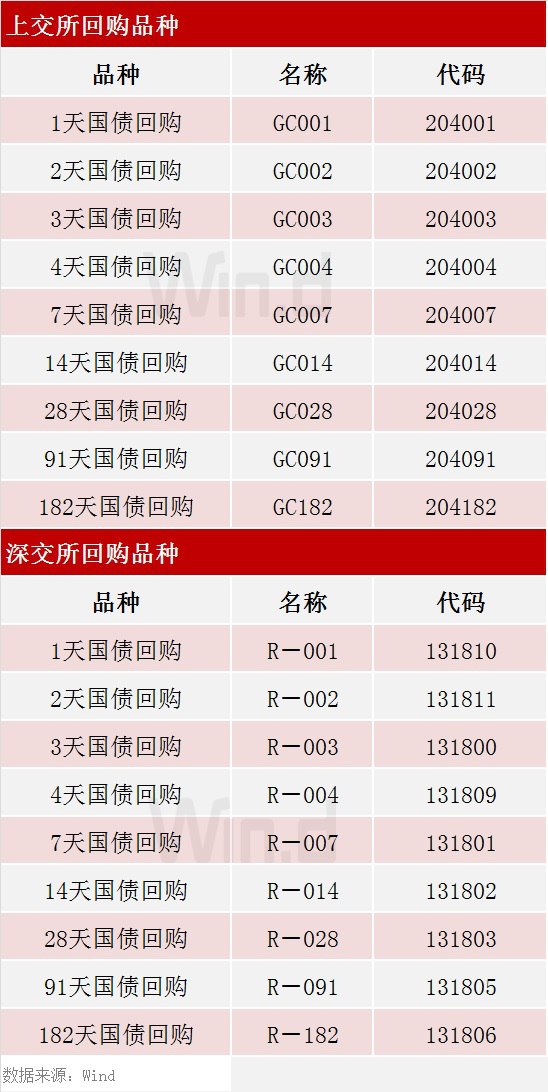逆回购分沪市和深市两个市场都有,期限各有1天期、2天期、3天期、4天期、7天期、14天期、28天期、91天期、182期等9个期限的品种。合计有18个品种。各自详细代码见下图。其中沪市操作10万元起,10万的整数倍申购,最高不超过1000万。而深市的门槛相对较低,1000元起,1000元的整倍数递增,没有最高限额。