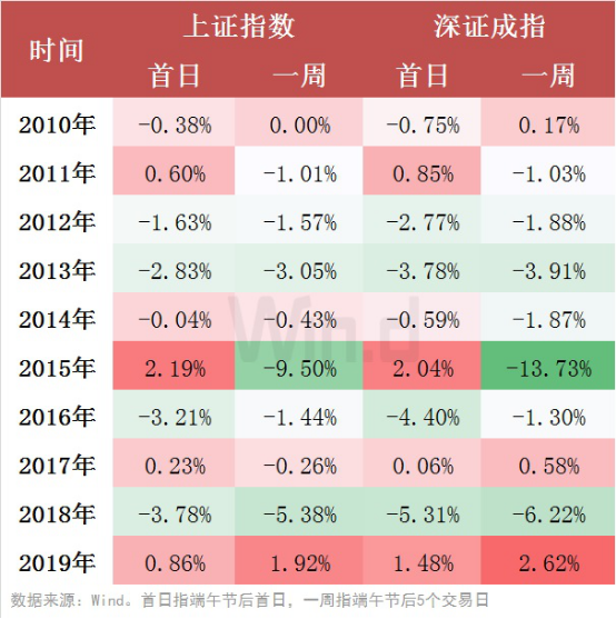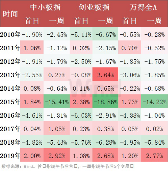 5、万得全A方面,Wind数据统计显示,过去10年,万得全A节后首日飘红4次,其中2015年涨幅最大,达1.73%;同期飘绿次数6次,其中2018年跌幅最大,达-4.95%。节后首周飘红2次,其中2019年涨幅最大,达2.77%;飘绿次数8次,其中2015年跌幅最大,达-14.22%。