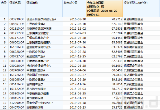 数据显示,截至6月22日,今年以来公募市场收益前20位的基金均为医药主题。其中,收益最高的创金合信医疗保健行业,年内收益超70%;广发医疗保健、宝盈医疗健康沪港深和工银瑞信前沿医疗的收益均超67%。这样的表现,较2019年上半年的消费主题基金,有过之而无不及。