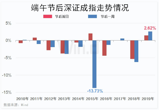 2、深证成指方面,Wind数据统计显示,过去10年,深证成指节后首日飘红4次,其中2015年涨幅最大,达2.04%;同期飘绿次数6次,其中2018年跌幅最大,达-5.31%。节后首周飘红3次,其中2019年涨幅最大,达2.62%;飘绿次数7次,其中2015年跌幅最大,达-13.73%。