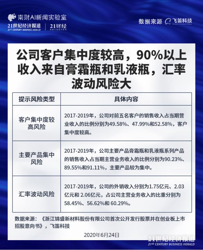 其次是主要产品集中风险,2017-2019年,公司主要产品膏霜瓶和乳液瓶系列产品的销售收入占当期主营业务收入的比例分别为90.23%、89.55%和91.11%。