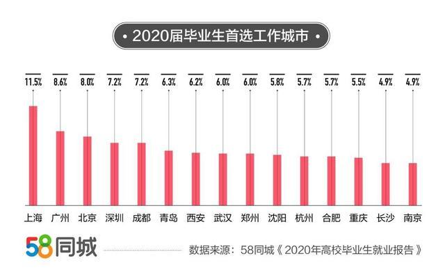在就业城市选择上,大城市是年轻人的首选,数据显示,选择上海的毕业生占比高达11.5%,其次是广州、北京和深圳。选择一线城市的毕业生,主要考虑因素为就业机会多、经济实力强等优势,而愿意留在新一线城市的毕业生,被离家近、人脉资源丰富、饮食习惯适宜、物价低等因素吸引。