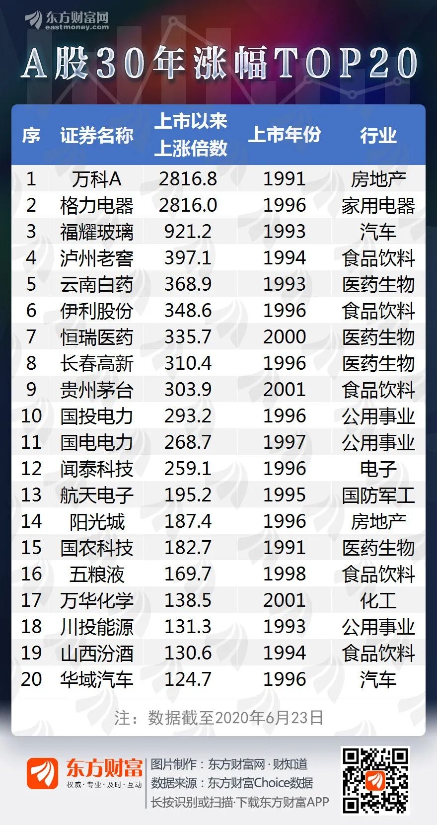 据东方财富Choice数据显示,剔除“老八股”,沪深两市3800多只股票中,2349股自上市以来股价翻倍,其中股价上涨超10倍股有448只,超百倍的有25股,超千倍的有2股。万科A、格力电器股价上涨均超2800倍,福耀玻璃股价上涨921倍。泸州老窖、云南白药、伊利股份、恒瑞医药、长春高新、贵州茅台等股价上涨均超300倍。