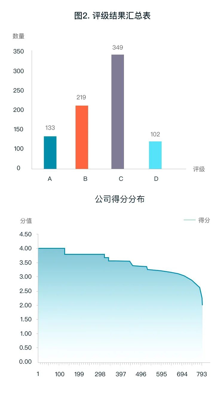 报告显示,测评为A类的企业133家,B类219家,C类349家,D类为102家。