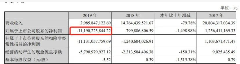财报显示,公司全年实现营业收入29.86亿元,同比下降79.78%;净利润亏损111.9亿元,去年同期盈利近8亿元,同比大降1498.98%.