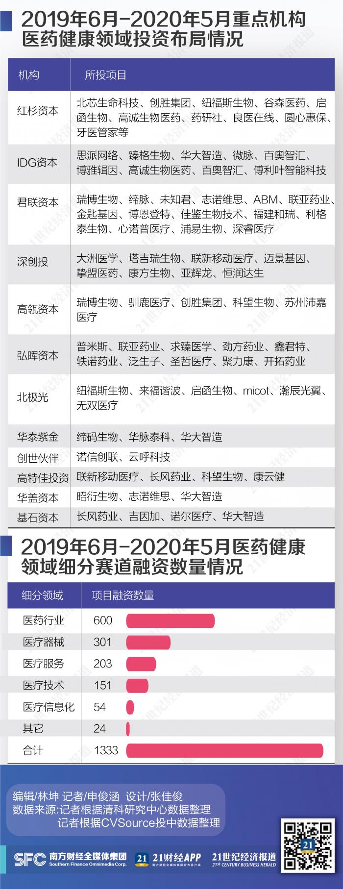 记者梳理CVSource投中数据发现,2019年6月-2020年5月的过去一年间,医药健康领域共发生1333起投融资事件。其中,医药行业就有600起,占比达45%。其次是医疗器械领域,发生301起投融资事件,占比达22.58%。医疗服务领域发生203起投融资事件,占比15.23%。另外,在医疗技术、医疗信息化等领域,也都有部分融资事件发生。