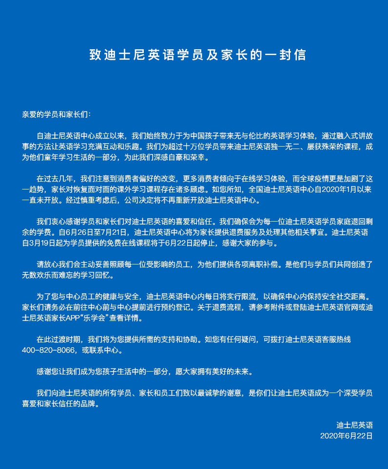 6月22日下午,迪士尼英语在其官网和微信公众号发布致学员及家长的公开信,宣布关闭中国的所有迪士尼英语中心,6月22日起停止提供免费在线课程,6月26日起为学员陆续退费,同时公司决定将不再重新开放迪士尼英语中心。
