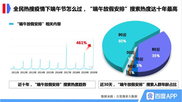 6月25日,百度搜索大数据显示,“端午放假安排”相关内容的搜索热度达到十年来的峰值,近7天环比上涨461%,其中超过6成关注者为90后。