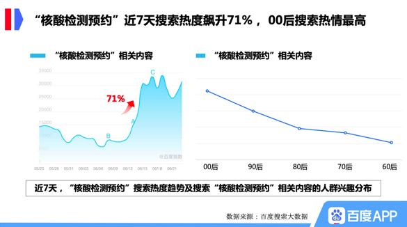 不过面对小长假,部分网友仍倾向于外出旅游,核酸检测的需求也随之水涨船高。百度搜索大数据显示,“核酸检测”相关内容的搜索热度近7天飙升71%,00后对此表现出了最高的搜索热情,或与其旺盛的旅游需求相关。