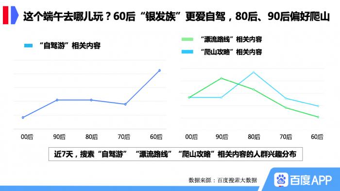据百度搜索大数据,60后“银发族”更倾向选择自驾游,他们是对“自驾游”相关内容搜索兴趣最高的群体。正处于“当打之年”的80后、90后体力充沛、热爱刺激,更青睐爬山、漂流等户外运动,他们对“爬山攻略”“漂流路线”等内容都呈现出更高的搜索兴趣。
