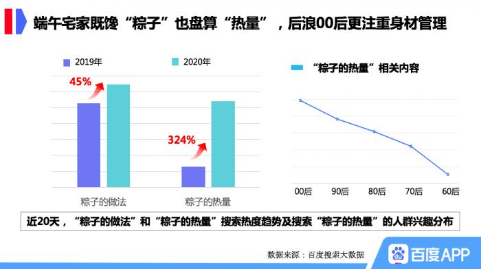 此外,网友在大快朵颐的同时不忘身材管理。百度搜索大数据显示,00后对粽子的热量搜索兴趣最高,而90后最关心“什么粽子好吃”,“中浪”已不像“后浪”执着于身材。