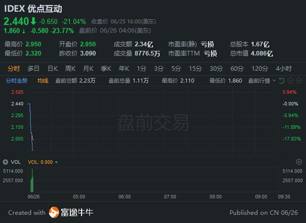 富途资讯6月26日消息,截止发稿,优点互动盘前跌23.77%,报1.86美元。