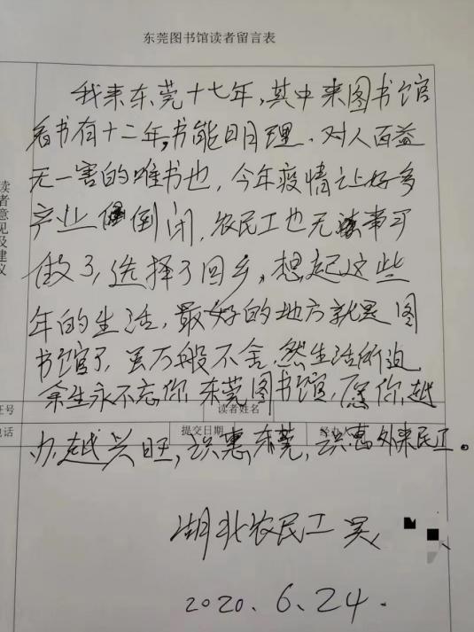 据了解,6月24日上午,吴桂春因失业本准备回乡,离开前特意前往东莞图书馆退还读者证。临走前工作人员希望这位在馆读书12年的老读者为图书馆留下寄语。“想起这些年的生活,最好的地方就是图书馆了......”130余字的留言,瞬间感动全网。