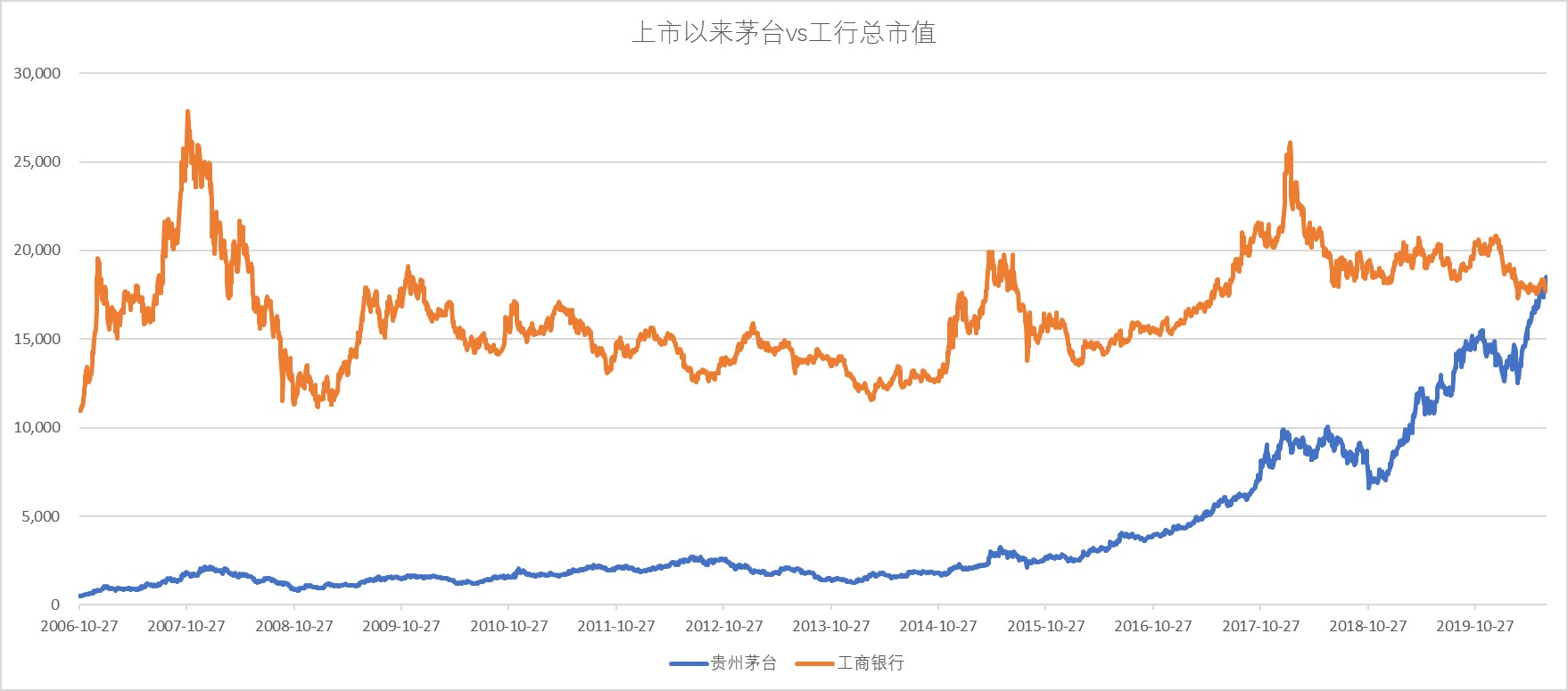自去年6月贵州茅台股价突破千元大关后,贵州茅台总市值何时能够超越工商银行便成为关注的焦点。