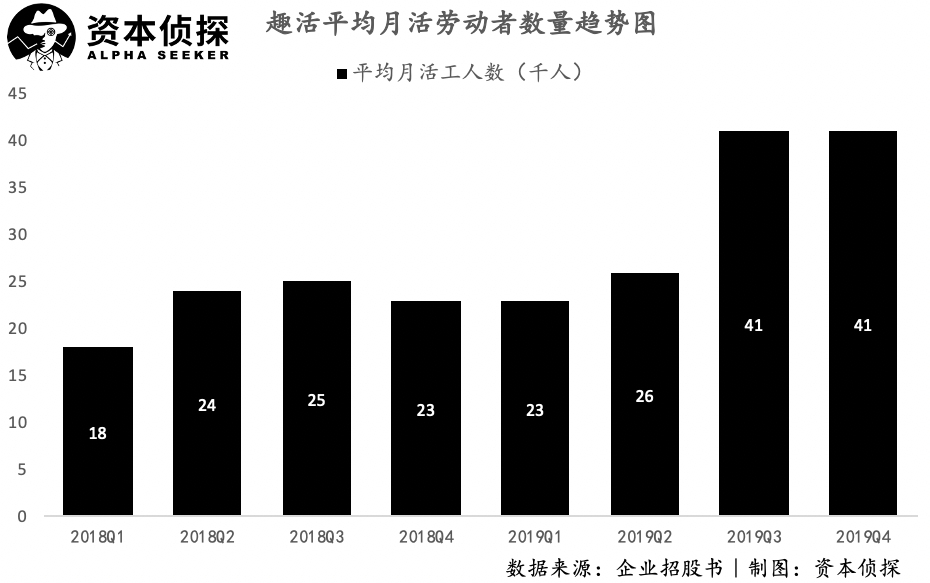 平台上劳动者人数是决定趣活业务水平的关键指标,从招股书披露的数据来看,这一指标在2019年下半年有较大幅度增长,平台劳动者突破4万人。