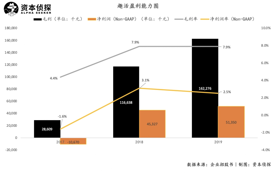 ▧ 趣活2019年实现毛利润1.6亿元,毛利率不足8%,而其在2017年毛利率低至4.4%;