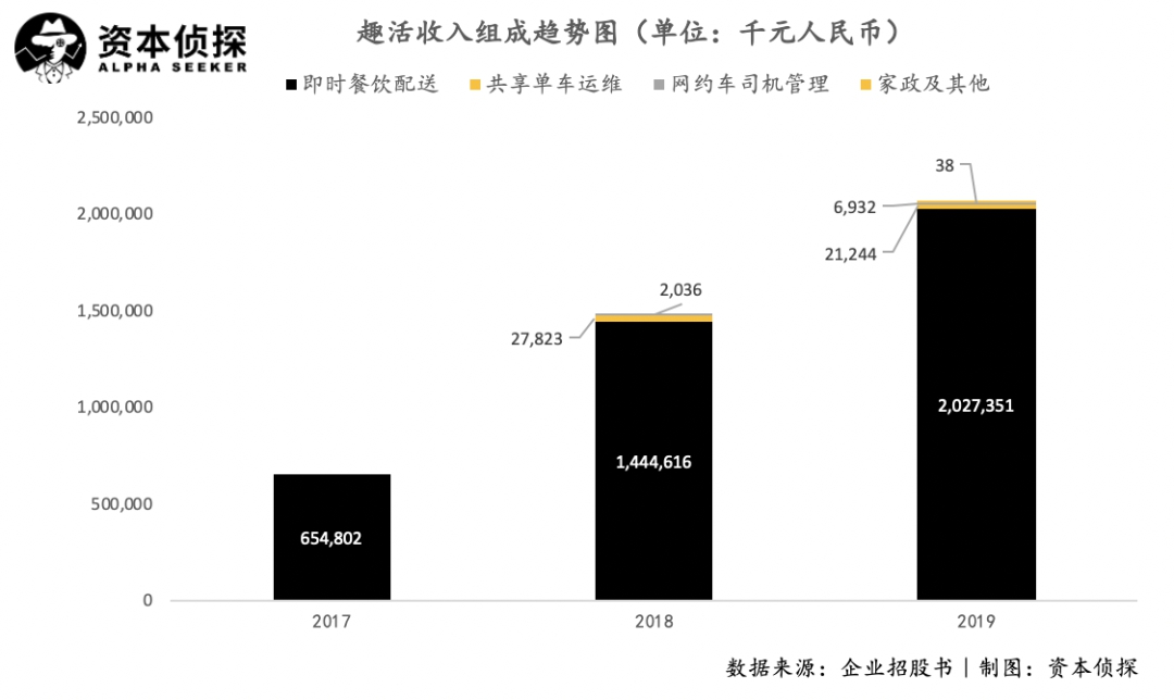 目前,趣活的业务包含即时餐饮配送、共享单车运维、网约车司机管理、家政及其他四大模块,其中餐饮配送业务占极大比例,几乎贡献了全部营收。