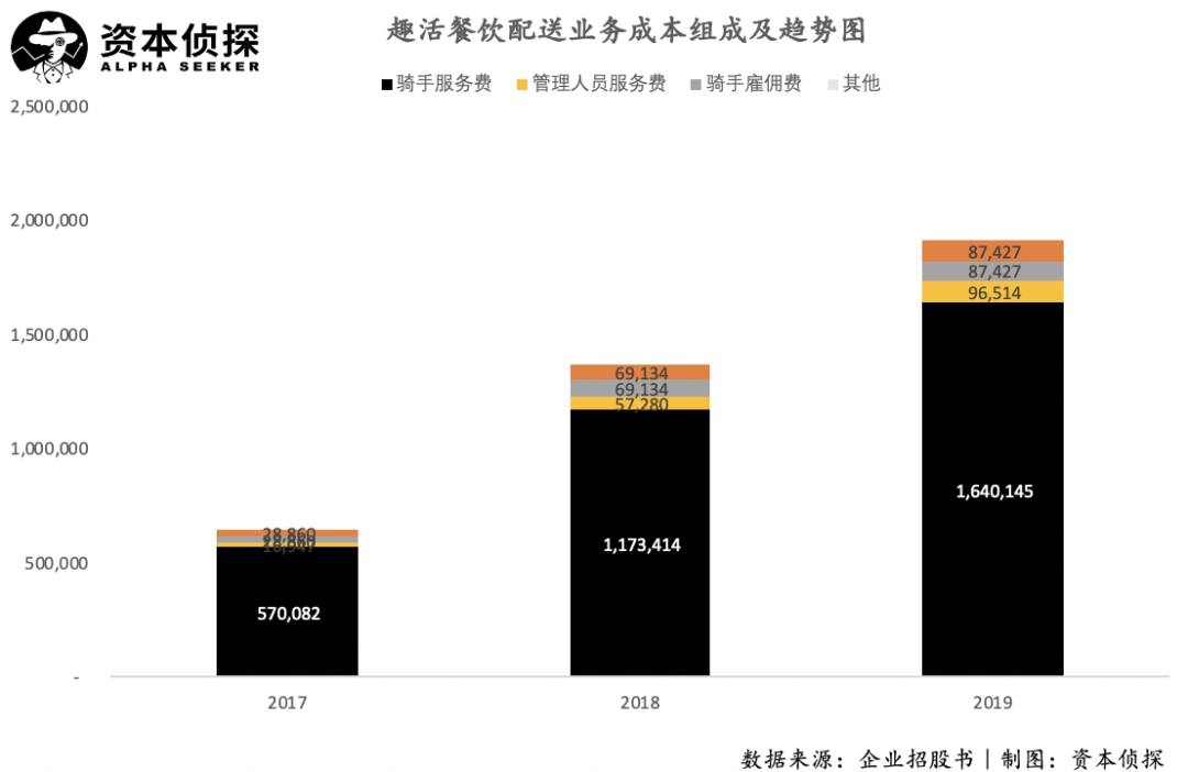 规模化的管理可以使成本得到一定程度的压缩。量化来看,在即时餐饮配送业务上,据2018年数据,趣活可以为客户节约每单40%的运营成本。