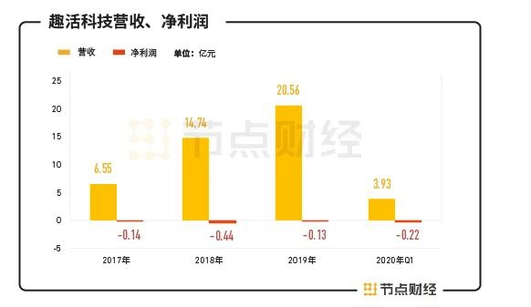 据招股书披露,2017年-2019年,趣活科技营收分别为6.55亿元、14.74亿元、20.56亿元,2018年较2017年增长125.04%,2019年较2018年增长39.48%。2020年一季度营收为3.93亿元,较上年同期的3.487亿元增长12.6%。